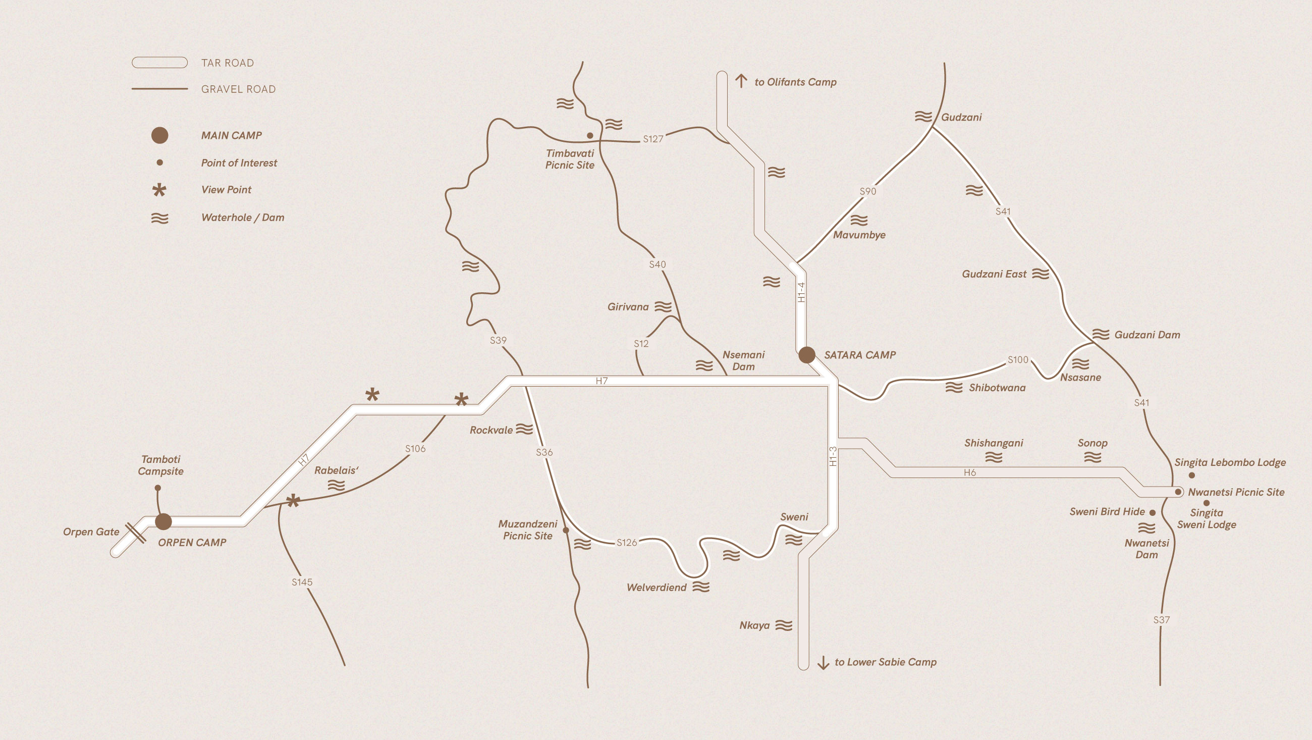 The main tar road from Orpen gate to Satara runs alongside the Timbavati River. Check the multiple viewpoints for wildlife. Nsemani Dam on the H7 is a must-stop for elephant, hippo, and various antelope species.