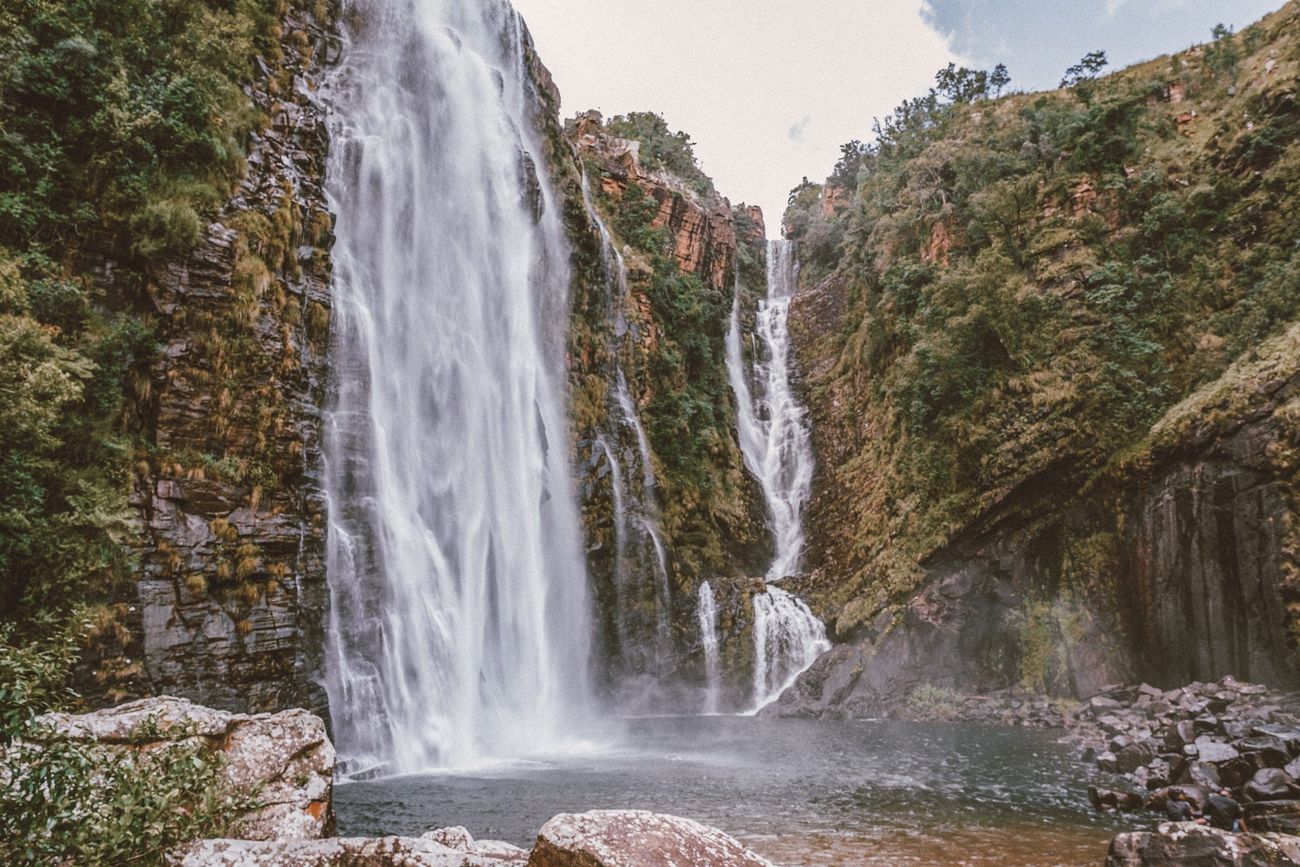 The 70 m twin waterfalls used to be a single stream. During the gold rush, miners blasted it apart to access the gold-bearing reef beneath. In the dry season, Mac Mac often merges back into one fall.