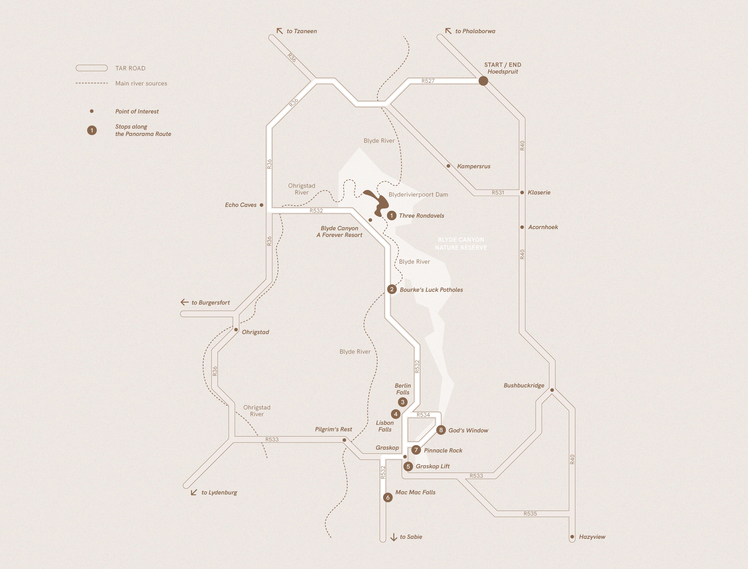 Officially starting in the South outside of Lyndenburg at the Long Tom Pass the route follows the Great Escarpment along the R532, finishing up at Echo Caves in the North. The 40 km stretch from Graskop to the iconic Three Rondavels is undoubtedly the most stunning section of the route, with breathtaking viewpoints like God’s Window, cascading waterfalls, and gorges that plunge up to 800 meters deep.